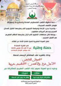 تعلن الهيئة المغربية لنصرة قضايا الأمة عن إطلاق حملة وطنية في الفترة الممتدة من 17 إلى 23 مارس 2025 على مواقع التواصل الاجتماعي؛ وذلك بالتغريد على الهاشتاج الرسمي للحملة: