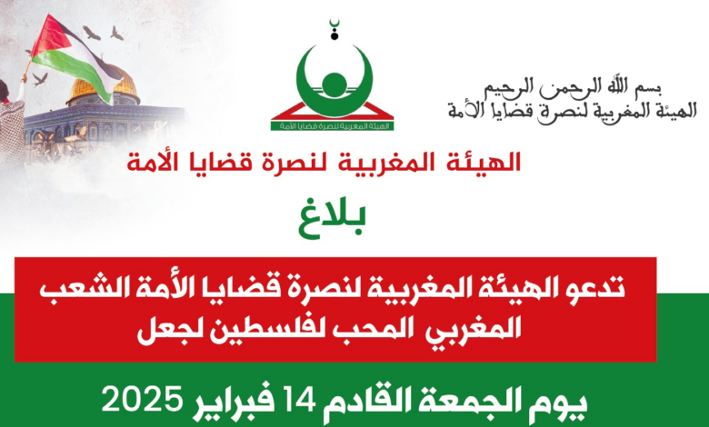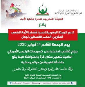 تدعو الهيئة المغربية لنصرة قضايا الأمة الشعب المغربي المحب لفلسطين لجعل يوم الجمعة القادم 14 فبراير 2025 يوم غضب احتجاجا على تصريحات الرئيس الأمريكي الداعية لتهجير سكان غزة والمتواطئة فيما يقع بالضفة الغربية من جرائم وحشية.