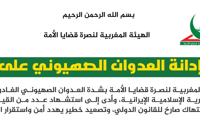 تُدين الهيئة المغربية لنصرة قضايا الأمة بشدة العدوان الصهيوني الغادر الذي استهدف أراضي الجمهورية الإسلامية الإيرانية، وأدى إلى استشهاد عدد من القيادات العسكرية والعلماء، في انتهاك صارخ للقانون الدولي، وتصعيد خطير يهدد أمن واستقرار المنطقة.