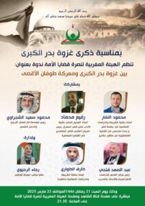 في إطار أنشطتها الموسمية وبمناسبة ذكرى غزوة بدر الكبرى، تنظم الهيئة المغربية لنصرة قضايا الأمة ندوة دولية بعنوان ” بين غزوة بدر الكبرى ومعركة طوفان الأقصى ” بمشاركة نخبة من الأساتذة والمفكرين والباحثين وذلك يوم السبت 22 مارس 2025 الساعة 21:30.