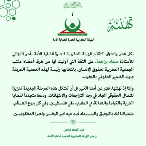 بكل فخر واعتزاز، تتقدّم الهيئة المغربية لنصرة قضايا الأمة بأحر التهاني للأستاذة سعاد براهمة، على الثقة التي أوليت لها من طرف أعضاء مكتب الجمعية المغربية لحقوق الإنسان، بانتخابها رئيسة لهذه الجمعية العريقة، صوت الضمير الحقوقي بالمغرب.