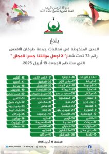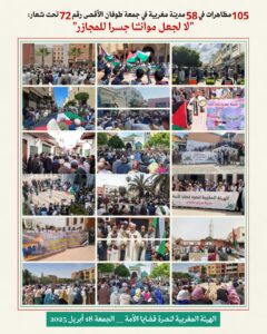 خرج المغاربة اليوم الجمعة 18 أبريل 2025 في 105 مظاهرة ب58 مدينة مغربية استجابة للهيئة المغربية لنصرة قضايا الأمة التي دعت للخروج في جمعة طوفان الأقصى رقم 72 تحت شعار” لا لجعل موانئنا جسرا للمجازر”.